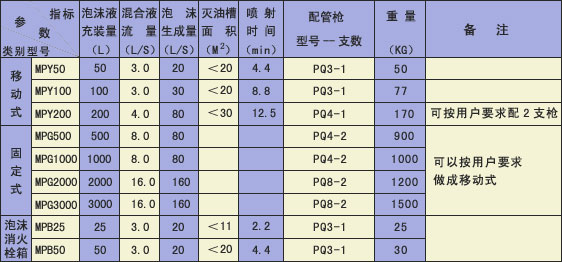 我公司生产的水力空气泡沫灭火设备系列产品包括如下几个种类: (一) MPY型移动式水力空气泡沫灭火设备--集泡沫液罐、比例混合器、泡沫管枪于一体,机动性好,且可独立使用。 (二) MPB型壁挂式水力泡沫消火栓箱--集泡沫桶,比例混合器、泡沫管枪等组合在一个箱子里,可以象消火栓箱一样地配置和安装,既能喷泡液,又能喷水,也能独立使用。 (三) MPG型固定式水利空气泡沫灭火设备--集比例混合器和泡沫液储罐于一体,有发兰式和内扣式两种连接方式。与泡沫管枪或泡沫灭火剂,可扑灭各种油类、醇类等可燃液体火灾。能广泛用于保护油库、汽车库、飞机场、轮船、码头、化工厂、燃油发电厂、炼油厂、酒精库、油脂厂等场合。