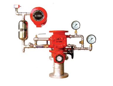 工作原理: 当自动喷淋灭火系统的保护区域内发出火情时,火场环境温度升高时,闭式喷头上的玻璃球炸裂(或易融合金融化),喷头打开喷水灭火。此时由于湿式报警阀出口侧管网水压下降,形成压差,阀瓣组件打开,水源水不断补充管网灭火,同时水流也经密封环槽内的孔流入延迟器,并迅速充满,以一定水压冲击水力警铃发出连续的报警声,压力开关动作接通电触点,接通控制中心,以声、光报警,同时启动主供水泵进行消防灭火。