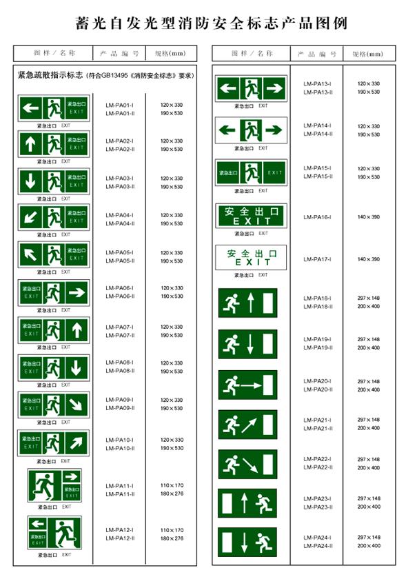 产品系列 蓄光自发光型消防安全标志包括:疏散通道、疏散楼梯、紧急出口、障碍物、消防器材标志以及警示、禁止、指令性标志。